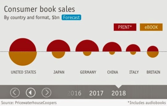 El estudio de PricewaterhouseCoopers analiza las ventas de libros en seis países: Estados Unidos, Japón, Alemania, China, Italia y Gran Bretaña. Basándose en el estudio, la revista The Economist se desarrolló una línea de tiempo interactiva. Como se puede ver en la imagen, según PricewaterhouseCoopers las ventas de libros electrónicos superan a las ventas de libros impresos en dos países: EE.UU. y Reino Unido, a la par que esto suceda, las ventas de libros en papel en estos dos países se reducirán aproximadamente en una quinta parte. En el resto de los países analizados, el mercado de libros electrónicos va a crecer, pero a un ritmo mucho menor.